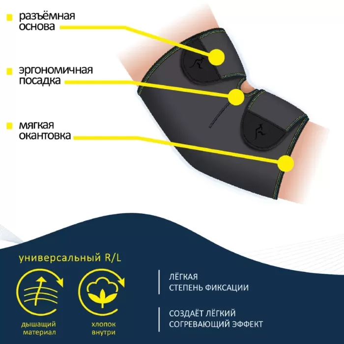 - Универсальный бандаж легкой степени фиксации для лечения и профилактики заболеваний локтевого сустава с возможностью регулировки по форме конечности - подходит людям любой комплекции, комфортен в использовании за счёт «дышащего» материала.