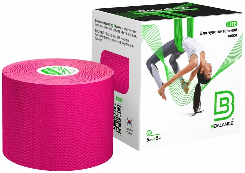 - Хлопковые кинезио тейпы BBTape (Био Баланс) с мягким клеем серии LITE идеально подойдут для тейпирования людей с чувствительной кожей, склонной к появлению аллергических реакций при применении стандартных кинезио тейпов, а также для детей с особо нежной кожей и для эстетического тейпирования в области лица и шеи.