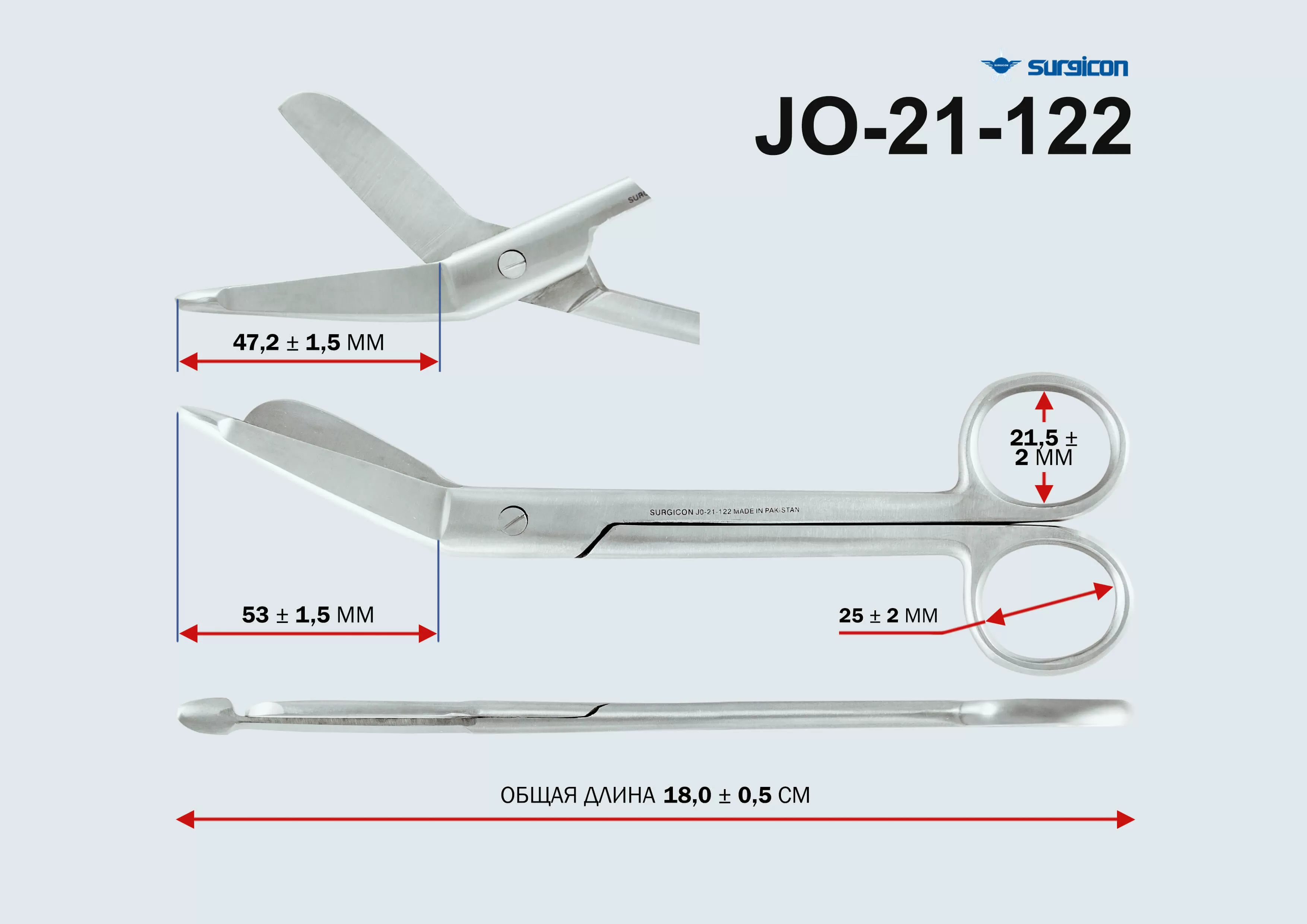 Двухлезвийный режущий медицинский инструмент с кольцевыми ручками лезвия изогнуты под углом, обушок одного из лезвий утолщен и расплющен на конце.