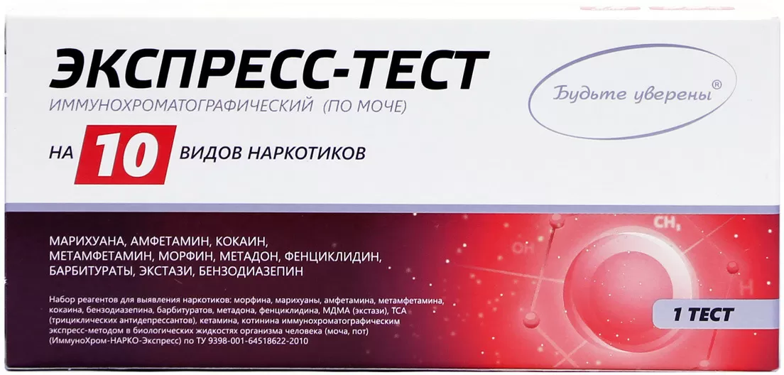 Набор ИммуноХром-Нарко-Экспресс предназначен для in vitro одноэтапного быстрого качественного определения наркотических соединений: морфина, марихуаны, амфетамина, метамфетамина, кокаина, бензодиазепина, барбитуратов, экстази, фенциклидина, метадона в биологических жидкостях организма человека в клинической практике (моча), а также для самоконтроля (моча).